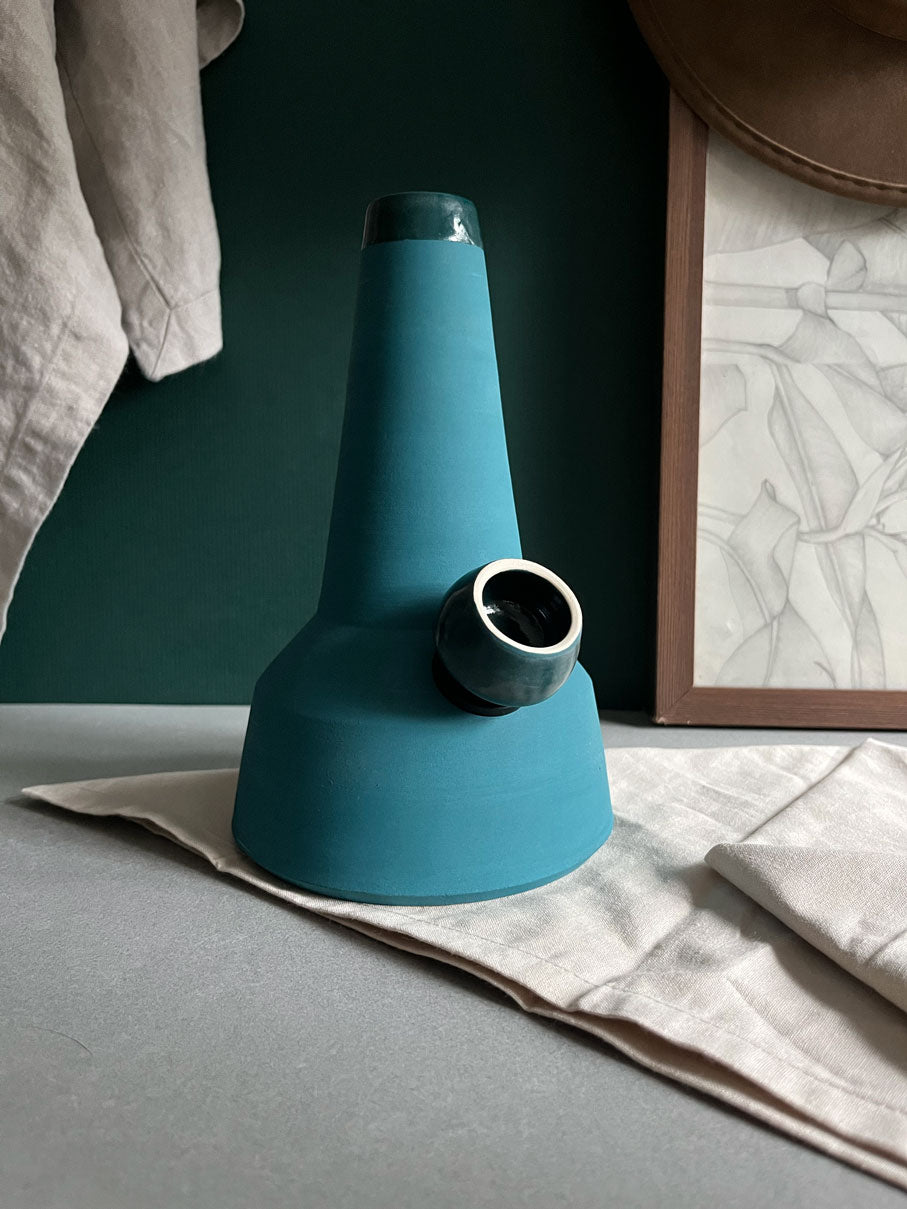 Moody and bold, the Phthalo Bubbler brings a deep, oceanic green-blue to your ritual, like the color of a wave just before it breaks. With its angular silhouette and clean lines, this piece feels sculptural and striking, a modern contrast to its curvier cousins. Thoughtfully designed with a built-in carb for airflow control and a stationary (but removable) downstem bowl, it’s made for smooth pulls and easy cleaning. Solid in your hand and just the right weight, it’s a seamless blend of art and function.