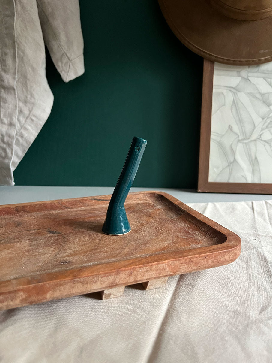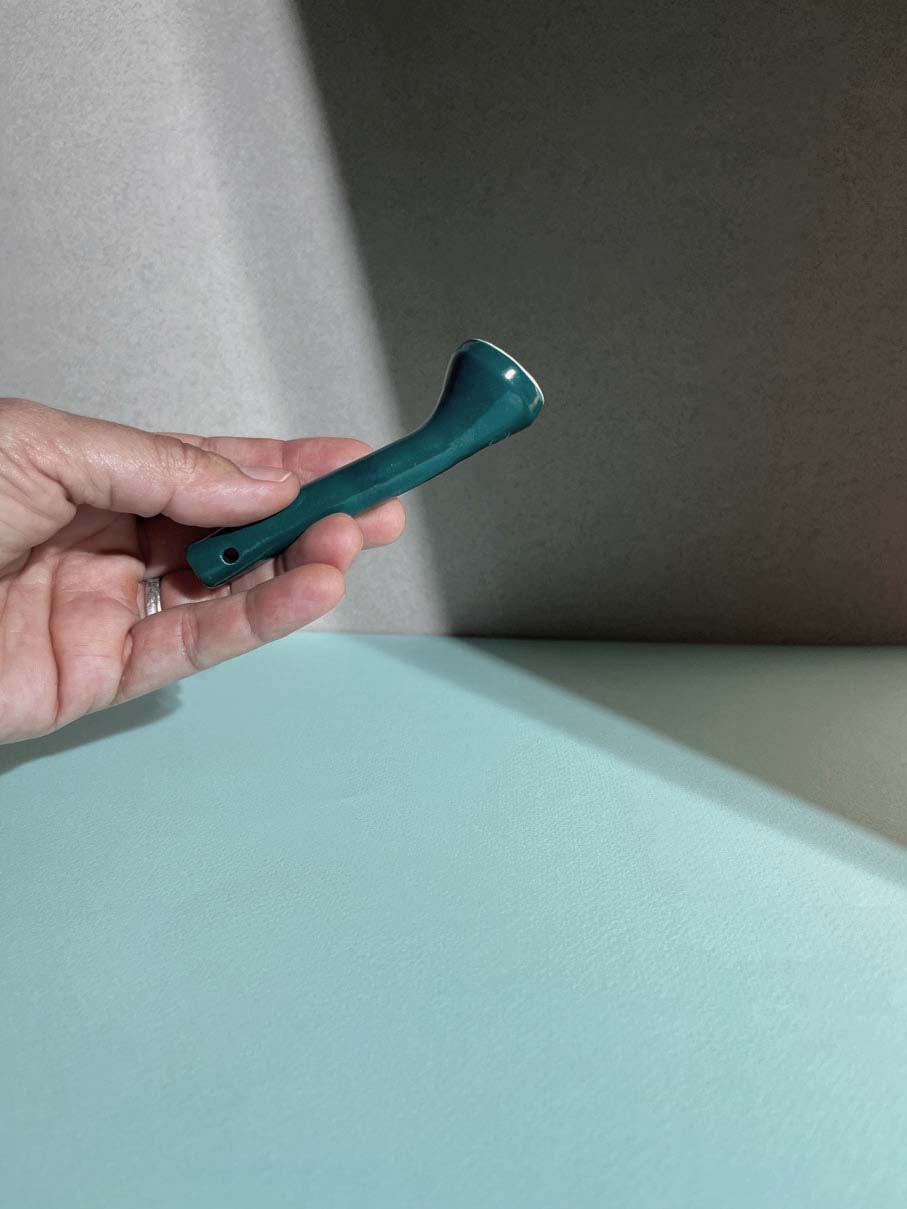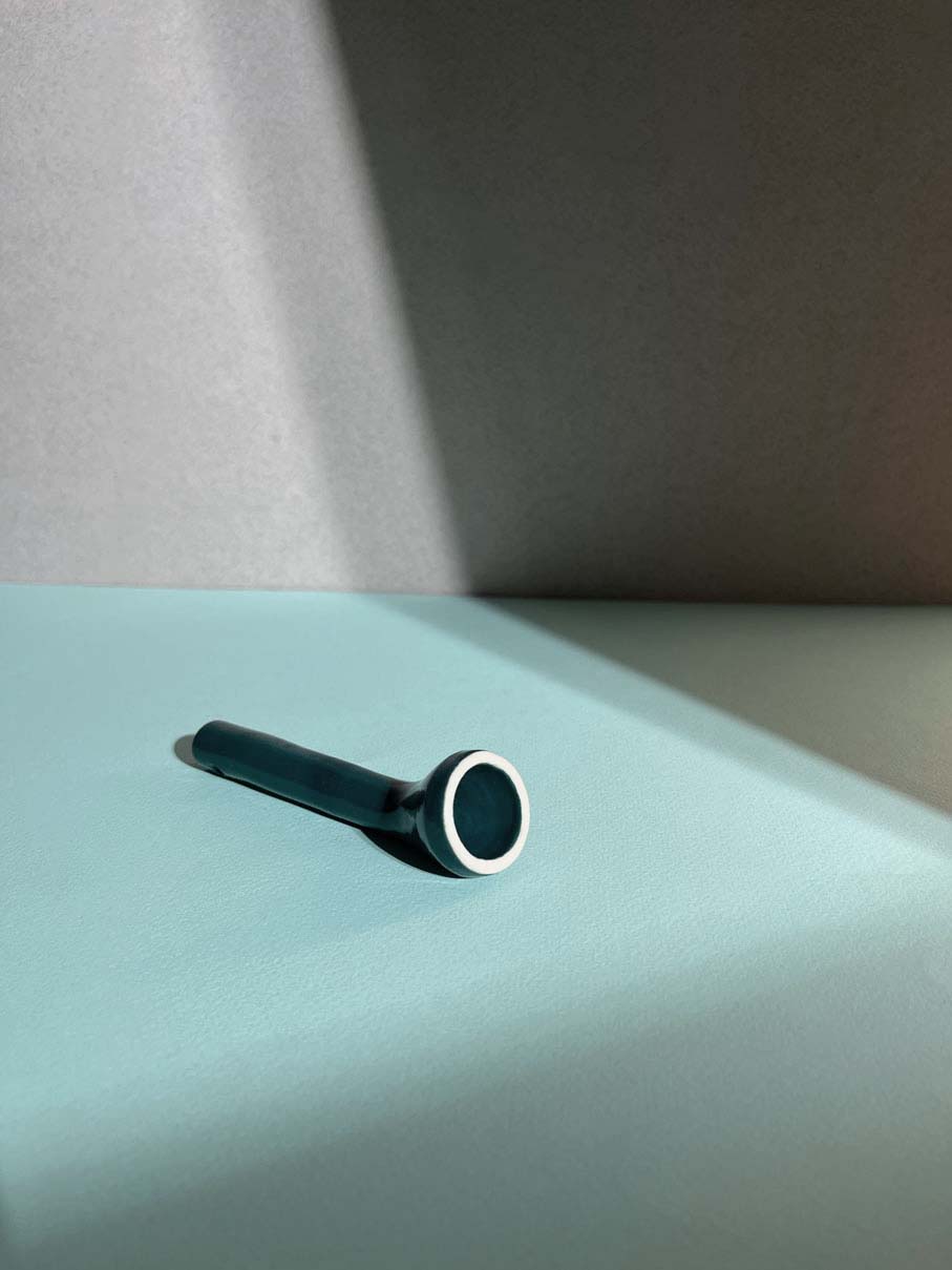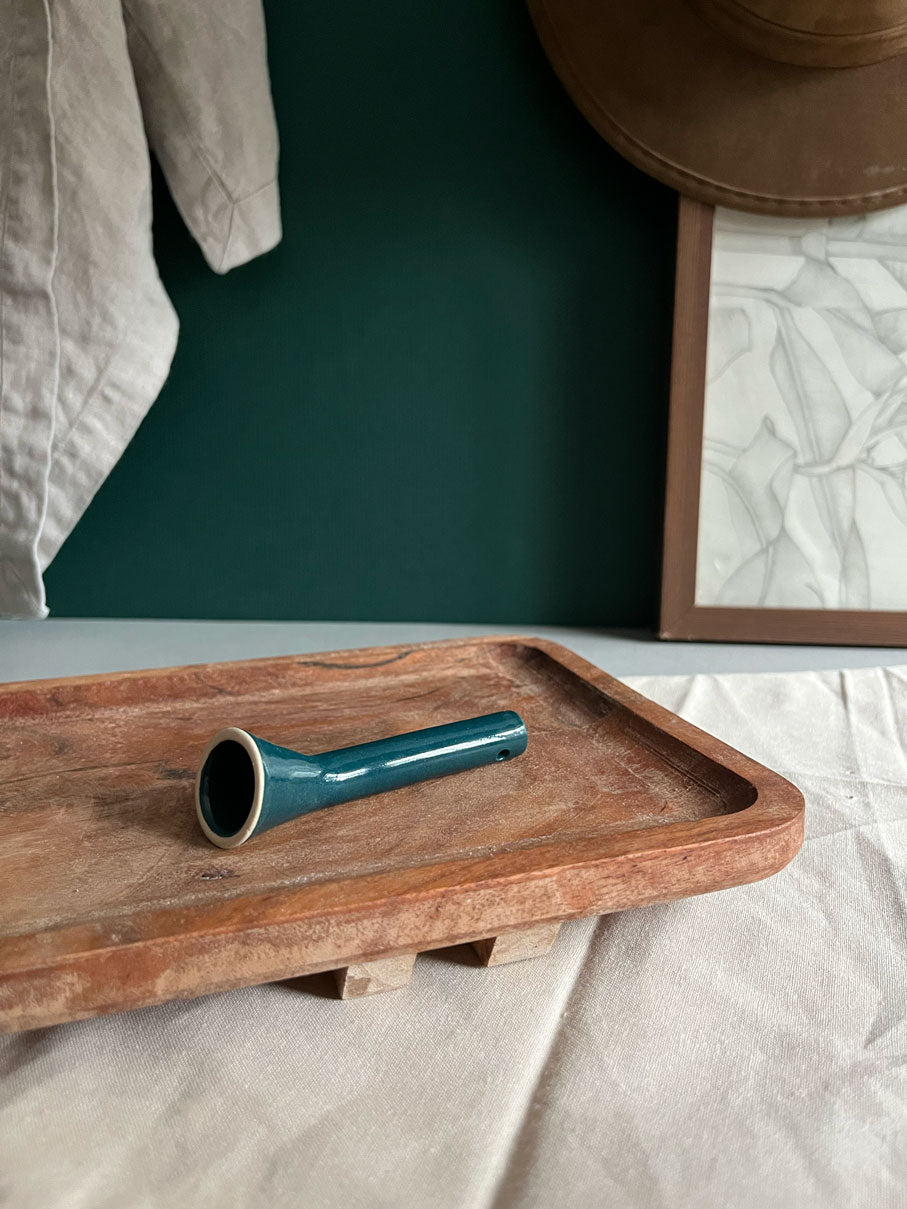 Each piece is hand-thrown on the wheel, shaped with care, and painted in that moody blue-green hue reminiscent of deep waters. As with any handcrafted item, slight variations in proportions and unique details make every downstem one of a kind. These nuances are a natural part of the process, adding individual character to each piece. Beauty marks are iconic :')