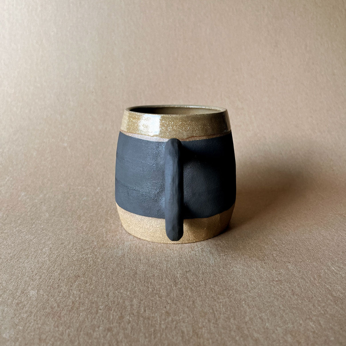 An elegant bulbous body form in brown stoneware, featuring a hammered raw exterior. Black underglazed exterior that looks like volcanic rock, with a clear glazed lip and interior.
