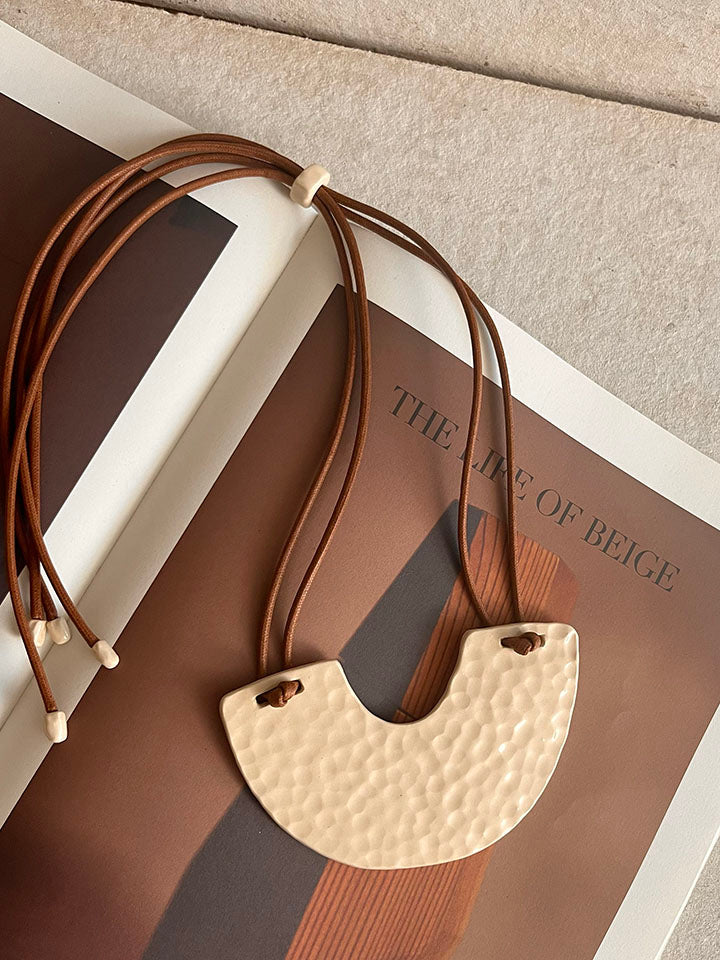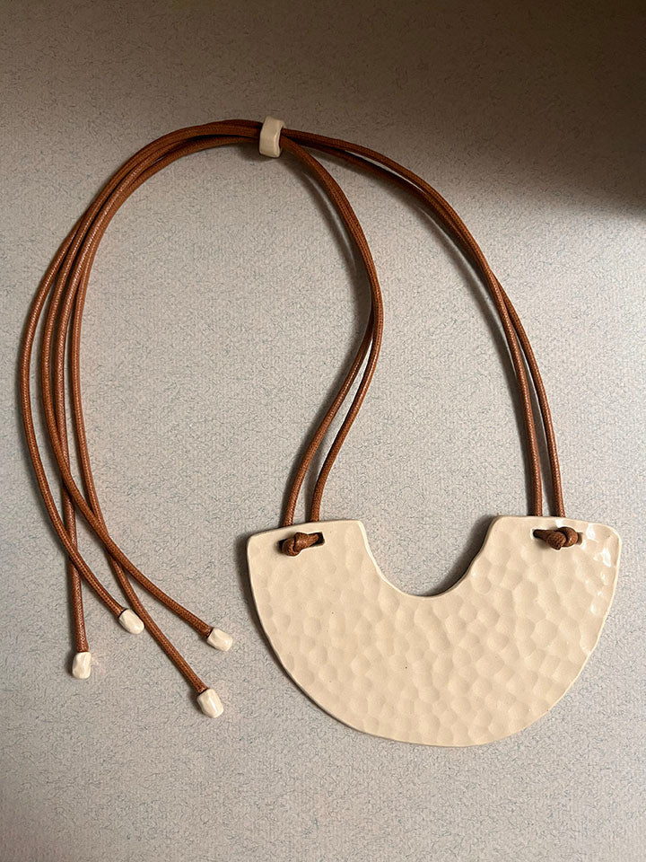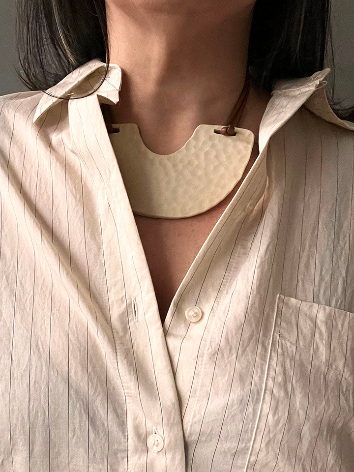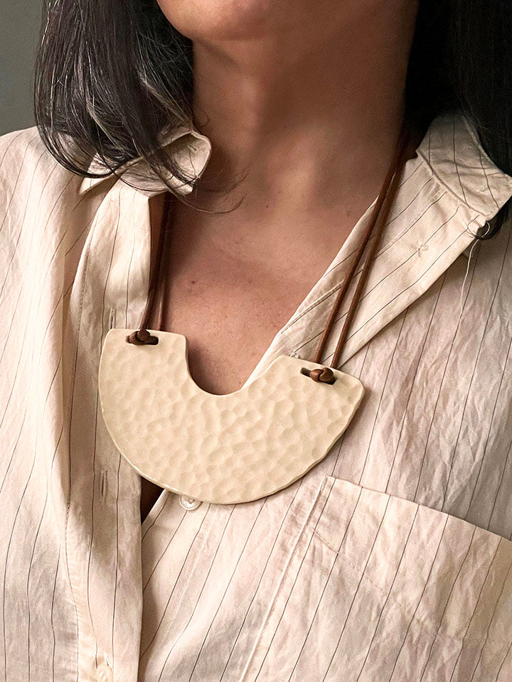 The Making: Each Arco is hand-cut and textured to a specific, refined thinness. By pushing the stoneware to this profile, the piece achieves a wearable weightlessness (approx. 2.9 oz). Because of this artistic refinement, the Arco should be handled with the same care as a fine sculptural object.