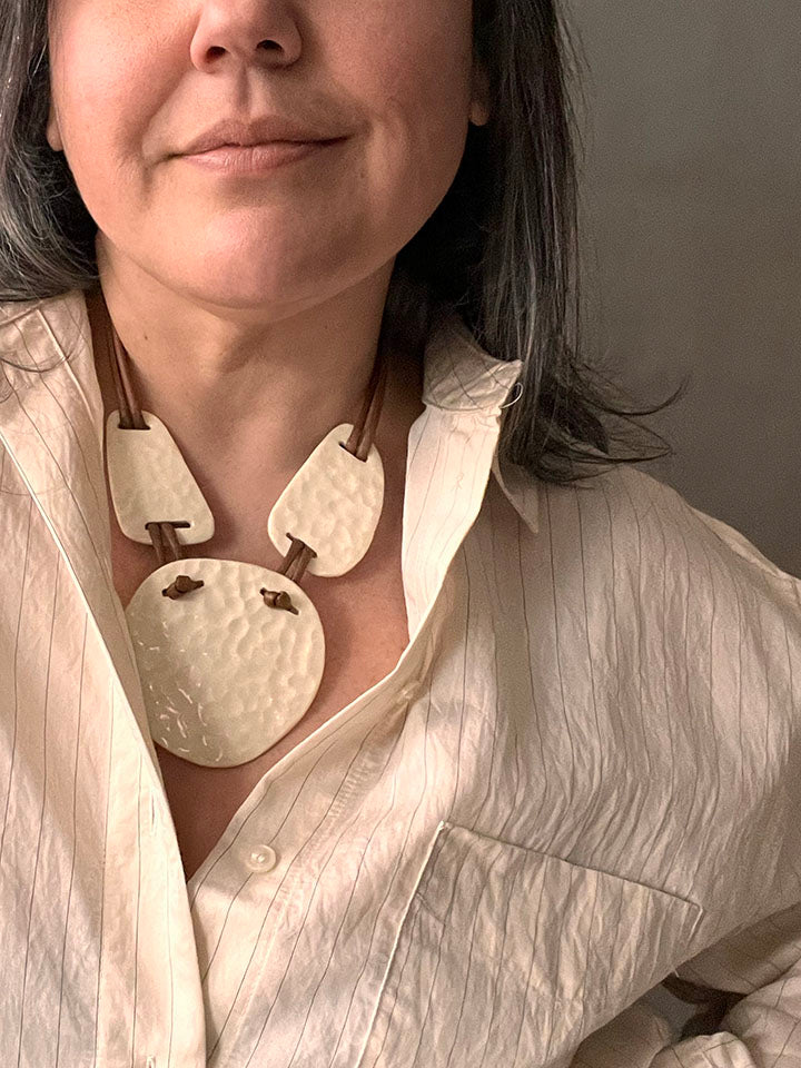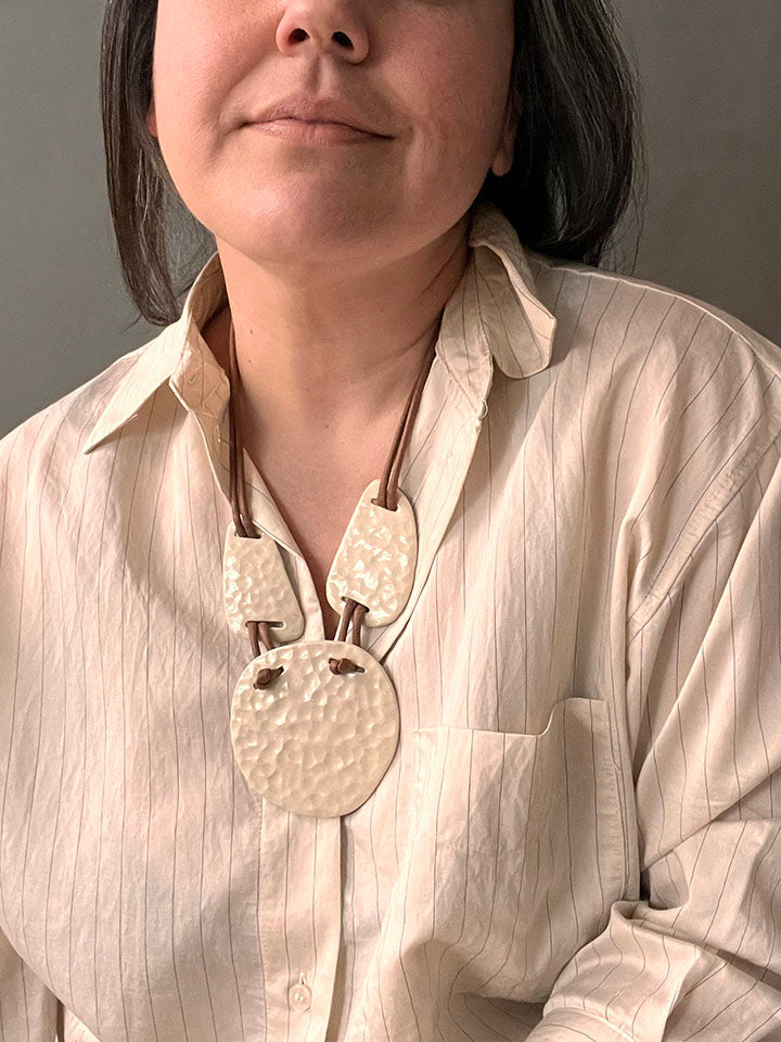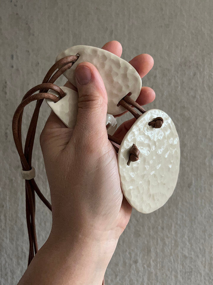 The Making: Each component of the Pendulum is hand-shaped to maintain a weight of roughly 3 oz, despite its expansive visual scale. This ensures a comfortable, wearable experience while maintaining the structural integrity of the stoneware. Like all pieces in the Lunar family, it is finished with the mark of the hand. The Pendulum is an art object for the body and should be treated as a precious heirloom.