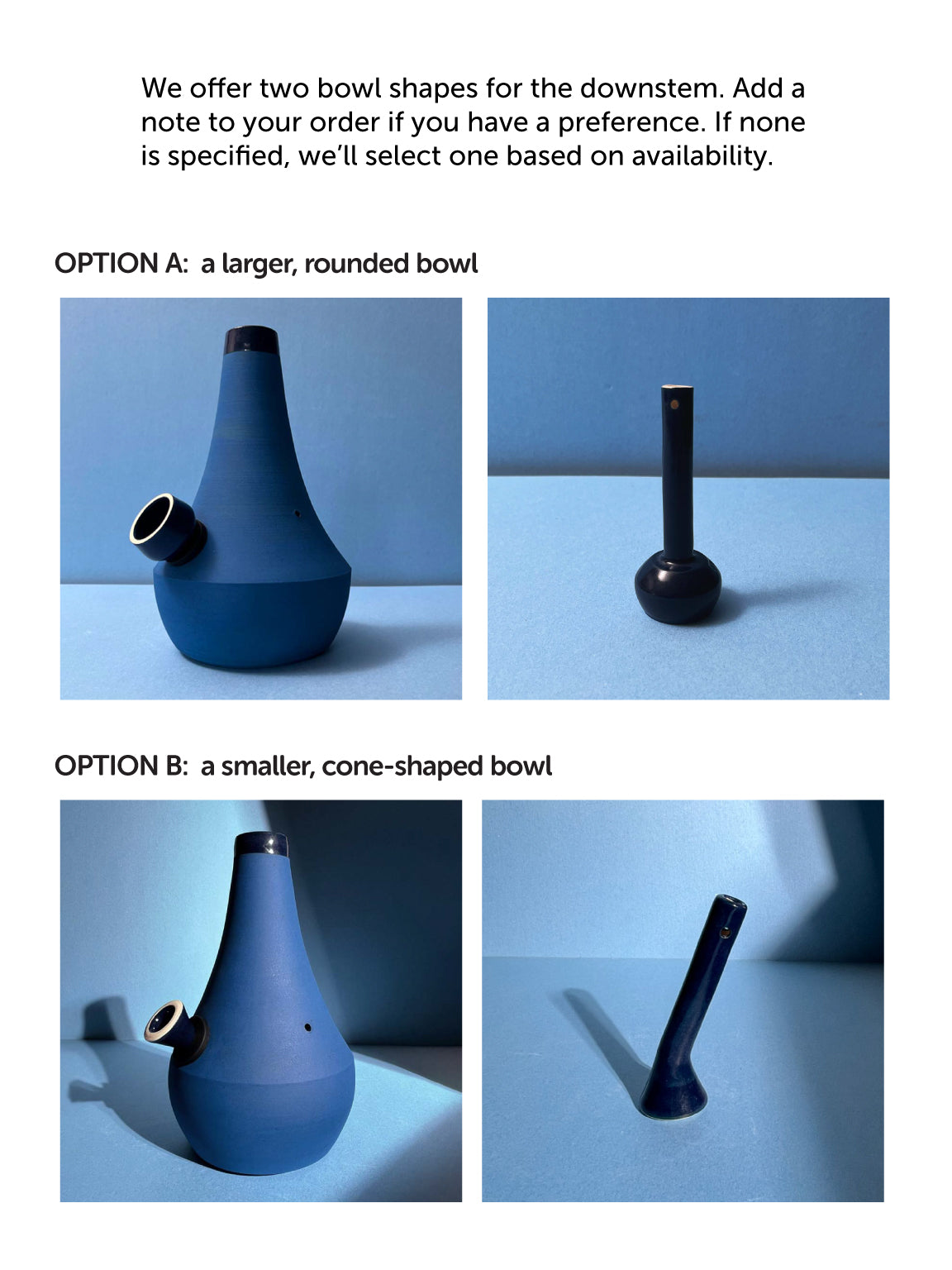 Please note: All bubbler photos listed show the original rounded bowl downstem. You can also choose a smaller, cone-shaped bowl option. Both are shown side by side in the comparison photo. If you have a preference, just add a note at checkout. Otherwise, we’ll select for you based on availability.